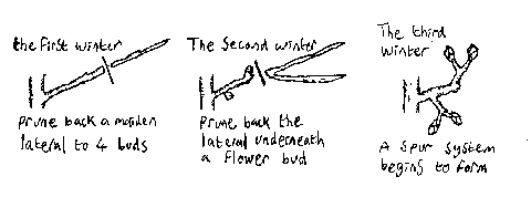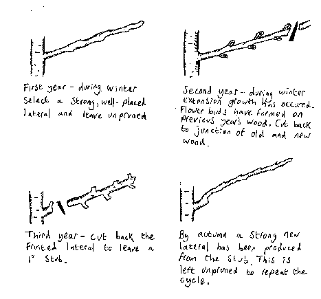 This also depends on the tendency of many apple and pear trees to form flower buds on unpruned two year old laterals. It is a technique best utilised for the strong laterals on the outer part of the tree where there is room for such growth.